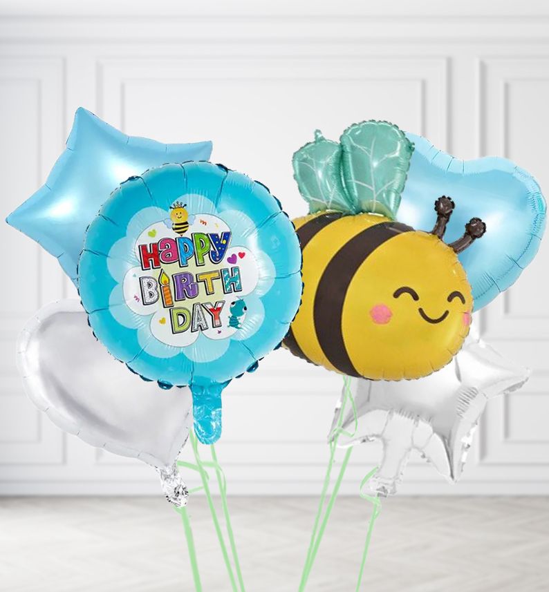 Blue Happy Birthday Bee balloon in a box. Shop helium balloons & balloon bunches online for birthdays, parties and general events, delivered to your door in UK. A special gift for your loved ones. Helium filled balloon