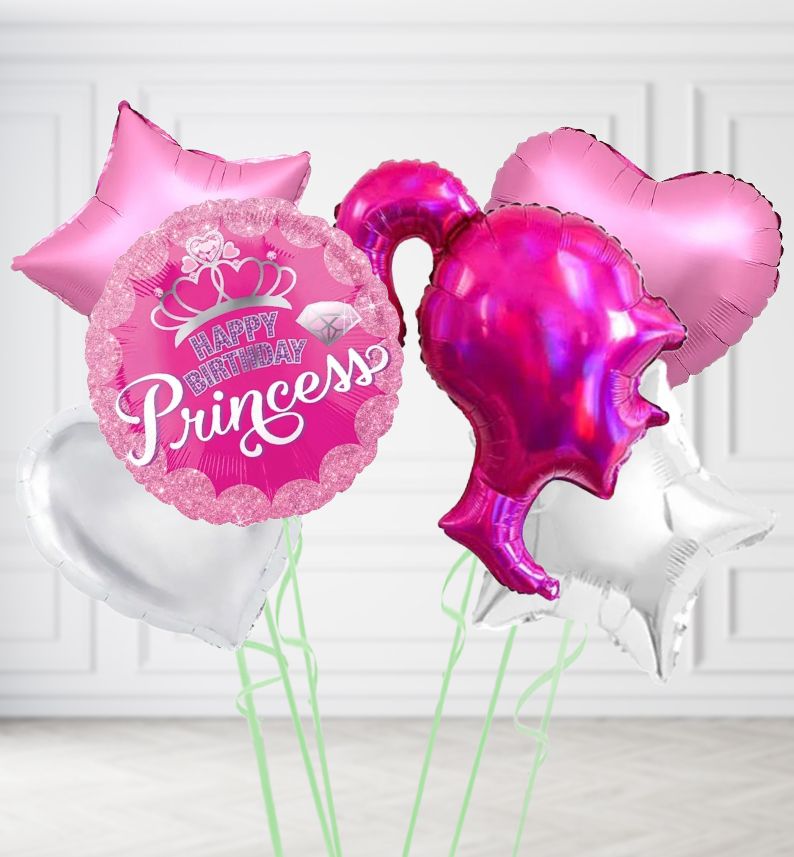 Detailed Description: A Round Princess Balloon featuring a "Happy birthday Princess" message with a crown, script text, hearts and sparkles. To build a lovely princess themed balloon bouquet add other balloons plus a choice of 2 x silver, pink or lilac plain foil balloons filled with helium and shipped in a lovely Cloud 9 Balloons Box. This Princess Balloon bouquet is an excellent choice for princess themed birthday parties.