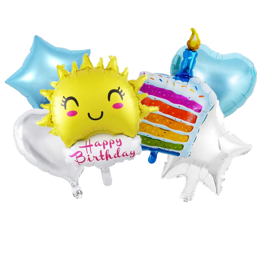 Description: A happy birthday sun-shaped foil helium balloon in a box. Popular for decorations for summer, sunshine-themed or general birthdays. Features a "Happy Birthday" script and floats using helium.