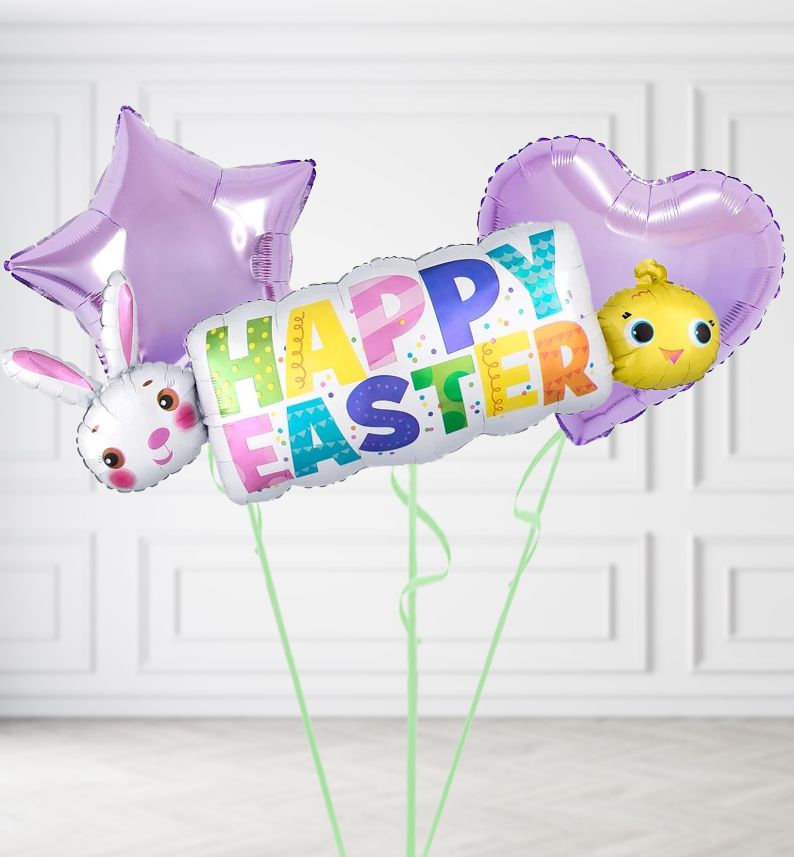 Detailed Description: A Jumbo sized Easter banner featuring the colourful words "Happy Easter" with dots and and Easter chick and bunny at either side. Helium balloons & balloon bunches for Easter, spring season and Easter parties, delivered to your door in UK. Helium filled balloons delivered.