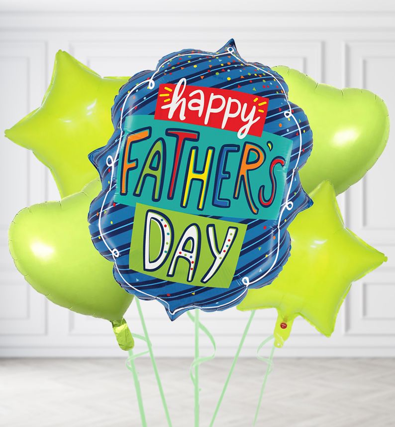 A huge fathers Day balloon for a young family. Featuring bold "Happy Fathers Day" words in a blue shield background with a choice of green, silver, red or blue side balloons. A perfect gift for your loved one.