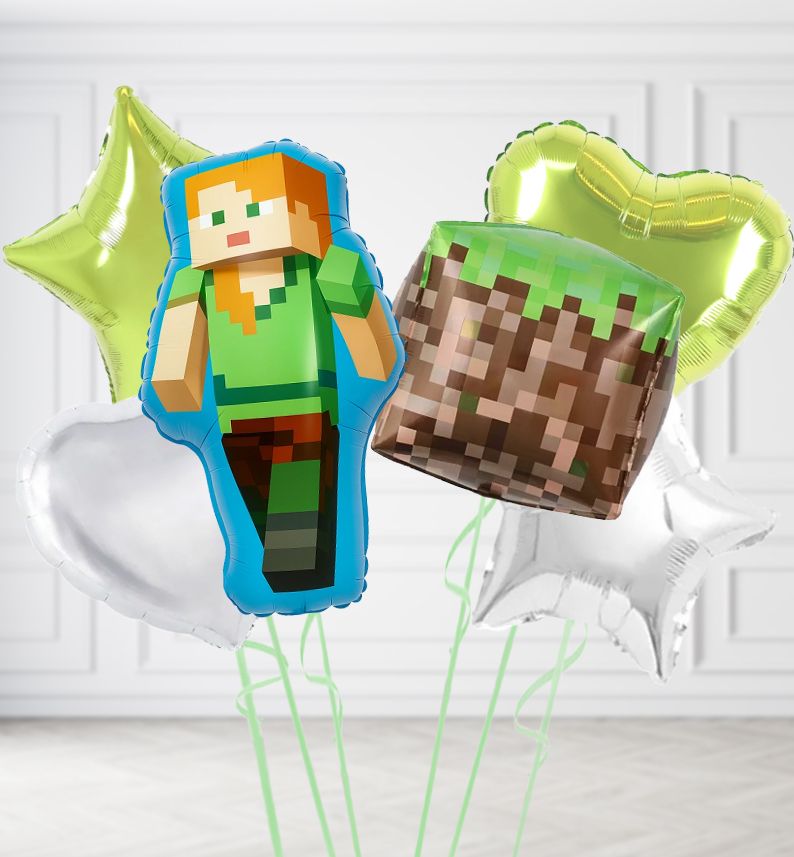 Detailed Description: An iconic Minecraft Alex Character Balloon bouquet featuring her green t-shirt ready for building. Build a balloon bouquet from a choice of other Minecraft balloons and plain foil balloons filled with helium and shipped in a lovely Cloud 9 Balloons Box. This Minecraft Alex Balloon is an excellent choice for Minecraft themed birthday parties.