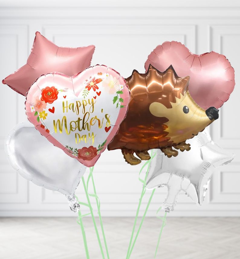 A beautiful dusty pink heart shaped balloon wishing "Happy Mothers Day" in gold script with roses and daisy shaped flowers