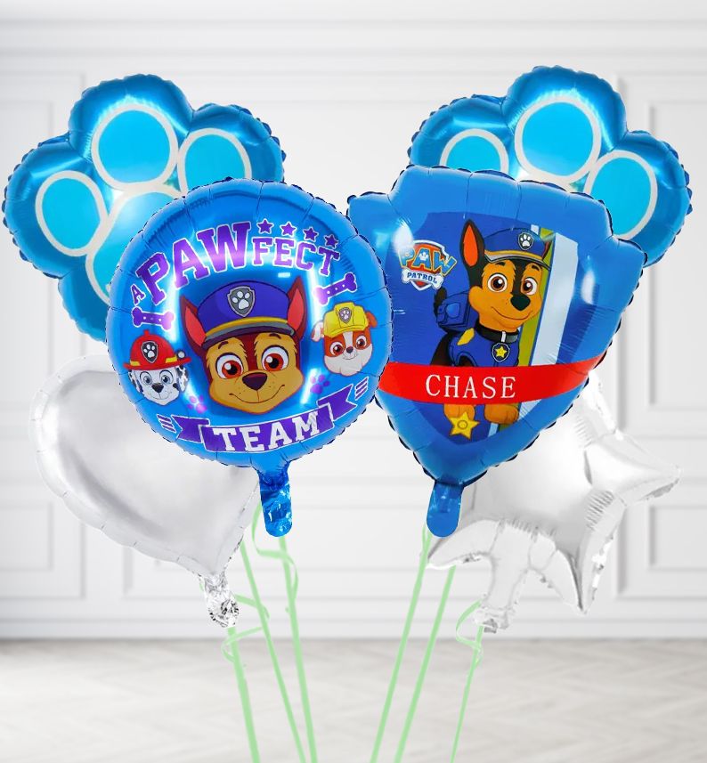 1 x Chase Shield, 1 x Round and 2 x Blue Paws plus 2 x plain foil balloons filled with helium and shipped in a lovely Cloud 9 Balloons Box.