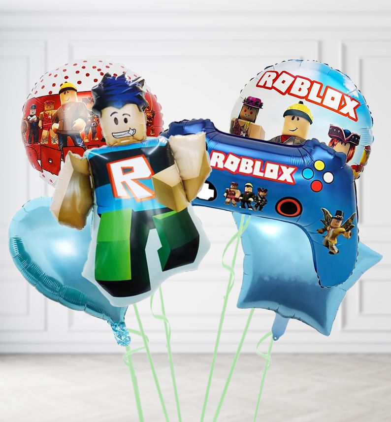 Description: A 6 piece Roblox Birthday Balloon bouquet featuring a Roblox character super-shape balloon, a XL Roblox game controller balloon, 2 x 18 inch Roblox themed round balloons, plus a choice of 2 x blue, red or silver plain foil balloons filled with helium and shipped in a lovely Cloud 9 Balloons Box. This Roblox Balloon bouquet is an excellent choice for Roblox and gamer themed birthday parties.