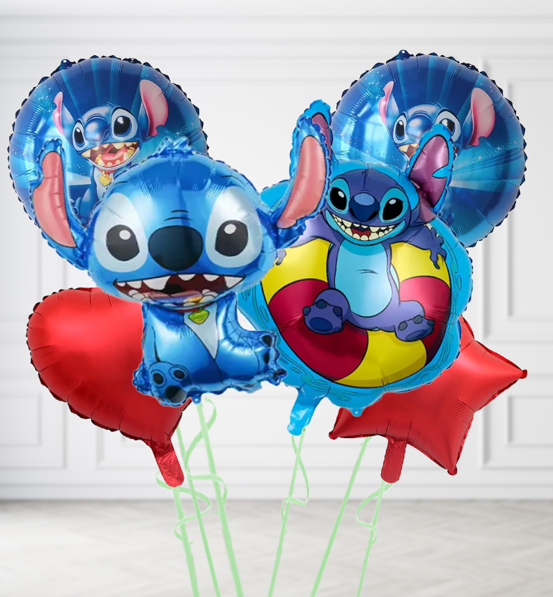 1 x XL Stitch Balloon, 1 x Stitch on a Lilo Balloon and 2 x Stitch Round Balloons 2 x plain foil balloons filled with helium and shipped in a lovely Cloud 9 Balloons Box.