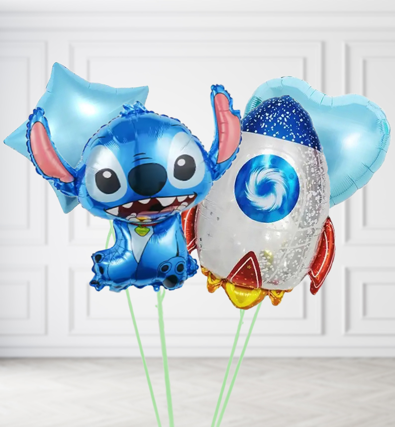 Stitch and Rocket Duo Balloons in a box for balloon number stacks and arches.