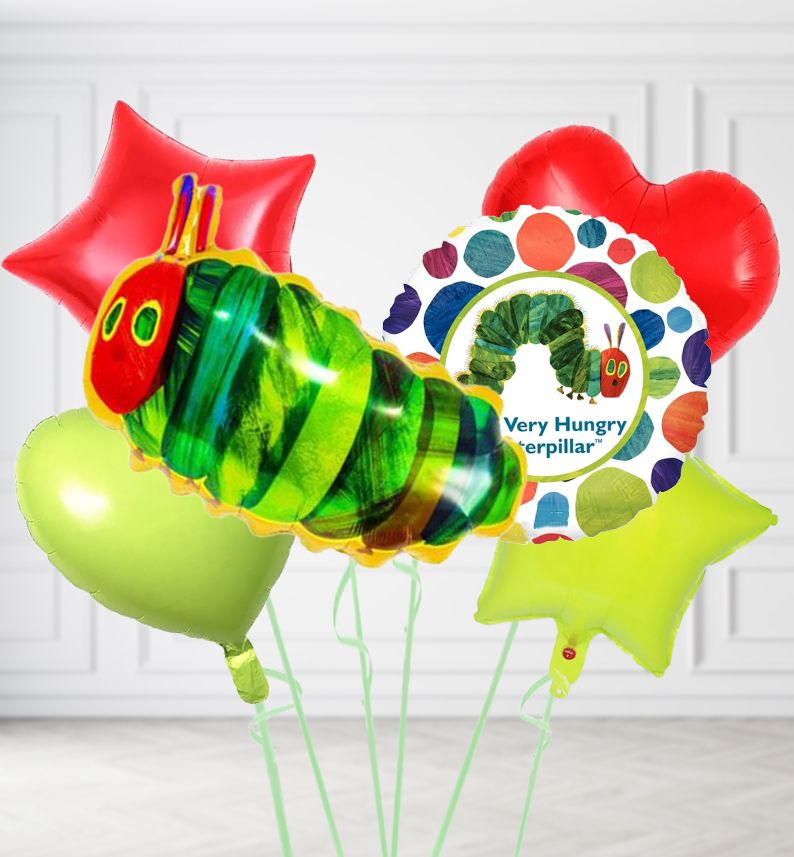 All Very Hungry Caterpillar Helium filled foil balloons are posted in a beautiful XL white Cloud 9 Balloons gift box.